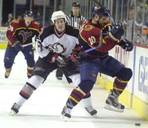 J. P. Dumont pressures Thrashers' Jeff Odgers along the boards in first period action Wednesday night as the Sabres staged a huge comeback victory.