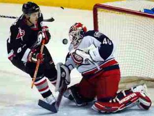 Daniel Briere gets the puck up on Columbus goalie Fred Brathwaite during first period action. The Sabres beat the Blue Jackets 6-0. [AP Photo/David Duprey]