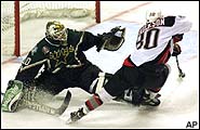 The second period ended with a lot of fireworks as Joe Nieuwendyk knocked over Dominik Hasek near the end of the period and the refs refused to make a call. That got under the Dominator's skin as he took matters into his own hands at the end of the period and got a roughing call for his efforts.