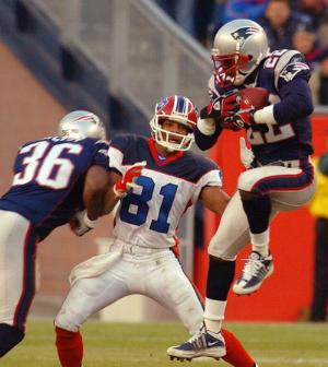 Then Bledsoe had his first pass picked off and the Pats were in business again. Anthony Pleasant got his hands on a Bledsoe pass and Richard Seymour picked it off returning it down to the Bills 9. Brady hit Donald Hayes in the endzone and the Pats were up 17-0.