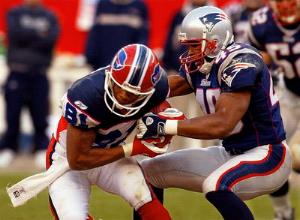The Bills did stage a comeback in the second half when Bledsoe hit Eric Moulds on a 12-yard touchdown pass, making it 20-10. But then Price had his timely fumble and the Pats made it 27-10 before the Bills scored very late in the game when Moulds made a sensational one-handed grab in the corner of the endzone. It appeared as if Moulds gloves had velcro on them as he leaped high and brought it down with one hand.