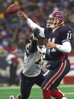 Bills quarterback Drew Bledsoe gets off pass as former Bill Marcellus Wiley puts the heat on in second quarter action. |