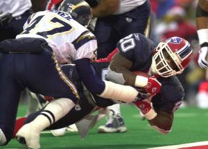 Former Bills QB Doug Flutie is as calm as a cucumber as the Bills try to put a little pressure on him. Flutie was unsucessful in getting the Chargers back to tie the Bills late in the game. |
