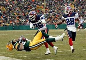 Bills corner Antoine Winfield delivers a helmet jarring hit on Packers wideout Terry Glenn in Bills 10-0 loss in Green Bay. |