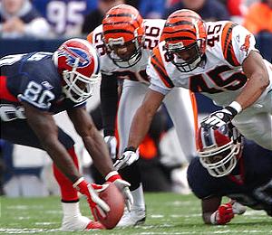 Eric Moulds is "Johnny on the spot" picking up a Travis Henry fumble and scampering to make yardage on the play. Moulds and Henry shared the spotlight in the Bills comeback overtime win.