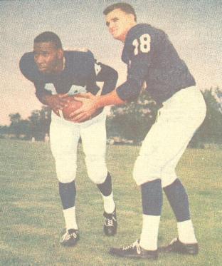 | Johnny Green, who coined the label "Golden Wheels" for Dubenion because of his speed, poses a handoff to Duby. |