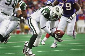 The Jets' John Abraham picks up a fumble by Rob Johnson and scores an early touchdown to put the Jets in the lead in an explosive first quarter. |