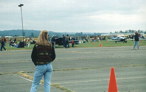 This is a shot of an RV-6 with a Navy paint job. It's infront of this lovely woman about a half a mile. Note the detail of the paint job and the intricate craftmanship.