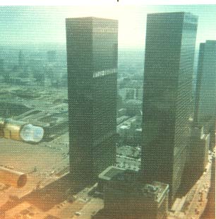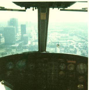 Shot from a Bell 212 on an EPA air pollution mission over downtown Los Angeles in 1973. Notice the air pollution probes in the far left of the photograph.
