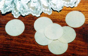 Detail of one Host that came from JESUS' Wounds. - Fr. Spies lifts a Host before OUR LADY'S image and the Crucifix is above, from where all Hosts came.