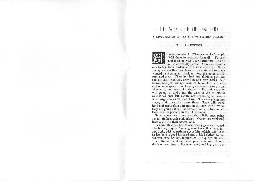 The story that follows is a phamplet printed in England in the 1800's. It tells of a young widower Stephen Tolladay and his voyage to Australia after the death of his wife aboard the ill fated ship Kapunda.