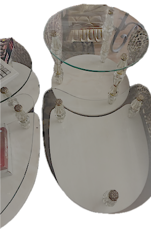 The 4 pieces can be combined in a variety of use and looks. Each table has a double tiered, clear glass top and veined white marble bottom shelf. The legs are crystals with carved antiqued brass which adds majesty to the tables. These table can be arranged in different combinations. Two oval 15" and a round 15" can be put together and Voila! you have a long coffee/cocktail table. Or they can be used as side tables.