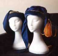 Chaperone (right) The splendour of the Italian Renaissance is captured here with rich velour crown the both hats are fully lined with brilliant gold taffeta. The chaperone to the right features metalic braid trim and hand pleating. $35.00 Order Now!The Moneylender The spirit of an impetuous young man is captured with this stunning hat. This hat is available in adult sizes as well. Looks fabulous with a full cape and tall boots on a brisk morning. Celtic design trim and fully lined in magnificent golden taffeta. $25.00 Order Now! |