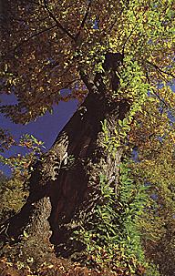 door het kappen van naburige bomen, die de stam in de schaduw hielden.