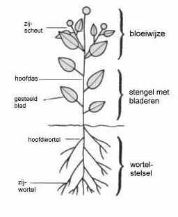 De hoofdwortel en de zijwortels vormen samen het wortelstelsel.