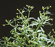 De handvormig gedeelde bladeren met 3 segmenten staan verspreid.