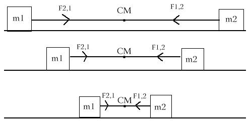 Notice in this diagram that the Center of Mass does not move! SO, the SYSTEM has a net force of zero. This makes sense inasmuch the two forces, F1,2 and –F2,1 add to zero.