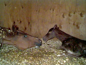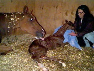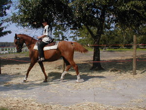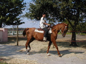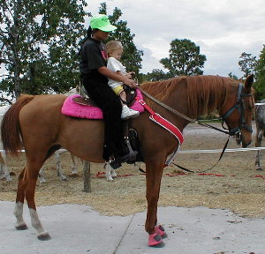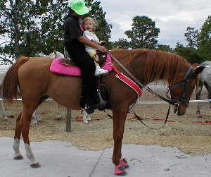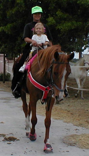Photographed here at the end of a trail ride with owner Lona Smith and her 2 year old daughter Lona Alida Marie. Amberly is a proud mother of a MORAB filly named AMBER'S PHONIX who was sired by RUDDELL'S SHADOW. Bred back to RUDDELL'S FLASH for a Morab foal in 2002. This new foal will be a Sabino. UPDATE: AMBERLY & RUDDELL'S FLASH gave us a Sabino Chestnut Colt on Feb. 14, 2002.