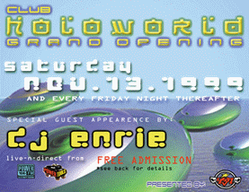 GRAND OPENING ON SATURDAY NOV.13.1999 AND HAPPENING EVERY FRIDAY NIGHT THEREAFTER. |
