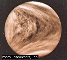 Venus is 67 millon miles awayfrom the sun. It was named after the Roman Godess of love. It is earth's sister planet. It is 7,500 miles in diameter. One day is 8 earth years, 2,920 days. It has no natural satelites (moons). Venus has a highland called Ishtar Terra, it is bigger than the United States. Venus' atmosphere is made of carbon dioxide. It has thick clouds that go around the planet in 4 days. It is the hottest planet, temp. reaches 896 degrees farenheight. It has erupting volcanoes, thunder storms, and acid rain.