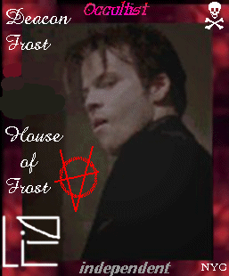 Who am i? i am Deacon Frost, Leader of House of Frost, Practicer of the Occult. I am an Independent man, if i want something i do it. No one controls my life. Or simple thing is.. they no longer exist. Im an animal, a fucking manic, a cold blooded Killer. You have to be in my line of work- A Vampire. Humans are cattle and here for our taking They are the Disease.. and we.. we are the Cure. Evoluntion baby. Everything changes. Destiny holds it all within her sweet soft hands. We are out there.. you just dont see is. We are sneaky bastards. back to myself.. my favorite subject. I'm good with computers, i dabble in medicine. I practicly own New York City with all my ties everywhere. Im a Student of Tae-Kwon-Do and marksmanship. I know the old tongue, the tongue of Erebus, now all...god rest their souls.. dead. Im over 200 years old funny that, i wont act like it. My favorite sword is my Katana Sword.. titanium alloy, acid etched.