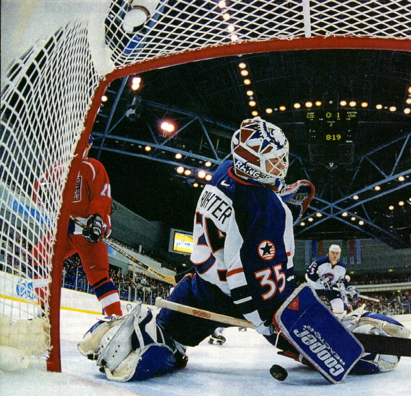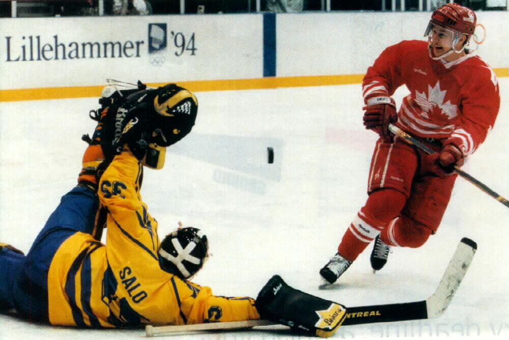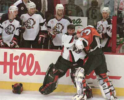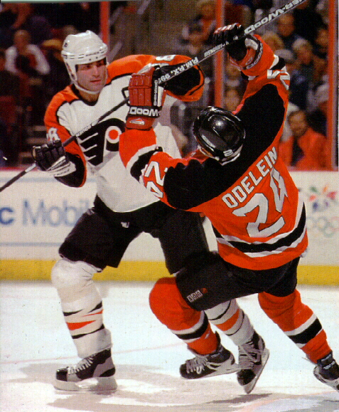 John LeClair getting dumped by Flyer teammate Peter Svoboda during the Olympics