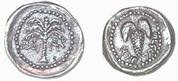 Judean Coin: Bar Kochba Revolt Ae 20mm, Obverse: A Palm tree stands in the center with seven Palm branches and two bunches of dates one on either side. Hebrew script "Jerusalem". Reverse: Ripe bunch of grapes with a small leaf. Hebrew script "For the Freedom of Jerusalem" |
