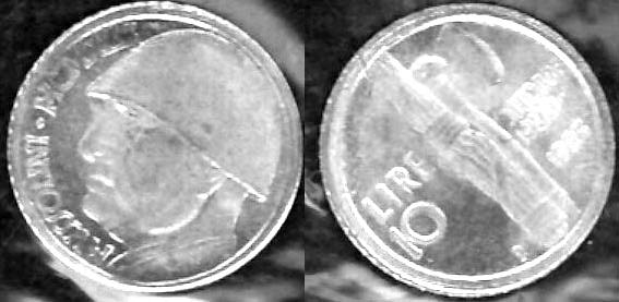 Mussolini fantasy coin Diameter of coin is about 11mm. On one side has head of Mussolini and letters "MVSSOLINI MCMXVIII" has letters "LIRE 10", "OTTOBRE 1922 1923" and mintmark "R". Image is axe and above has head of sheep. A fantasy piece. This was not a regularly issued coin. Dated 1918, a series of these made in both silver and gold in 1943. |