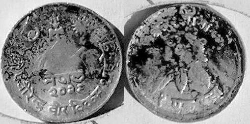 1969 Nepal 1 paisa This is a minor aluminum coin that was buried for some time. From Mahendra Vira Vikrama, Dated 2026. This coin is dated in the Vikrama Samvat (VS) era. To convert these dates to AD, take the VS date and subtract 57. This dating system has been used in Nepal from about 1888 to the present. That's the national flower of Nepal on the reverse. |
