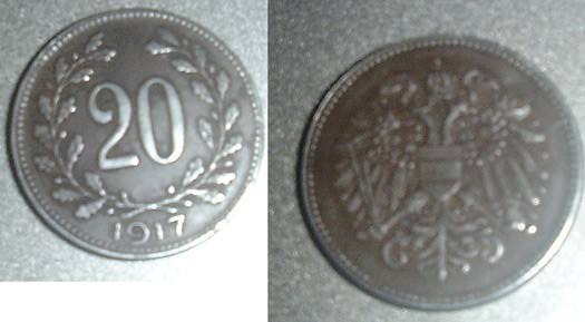 An Austrian 20 heller coin Dated 1917, this coin is made of iron and was only made for three years. |