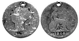 British Guiana This is an interesting one dated 1854. You will note the only letters visible on the coin are 'CE'. Although this coin is the design of the British homeland penny (and half penny). The letters 'CE' point to a different denomination. So, this is a 4 pence coin produced primarily for use in British Guiana from 1838-1862. All other 4P coins have a different reverse. In this poor condition, the coin isn't worth much more than its silver weight value. Even in fine condition its only worth a few bucks (without a hole). Had it been 1853 or 1852 it would be worth hundreds. |