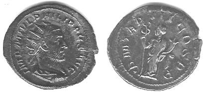 A roman coin, found in southern Germany an Antoninianus of the emperor Philip I (Marcus Julius Philippus). He ruled from 244-249 AD. The reverse depicts Felicitas. He was killed battling the legions of Trajan Decius |