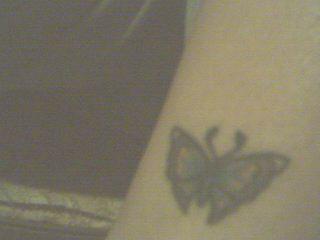 My butterfly. It was my first tattoo, but also my third. The first time I had it done, the colour didn't stay and it looked like a blue blob on my ankle. The outline was faint and it was just ugly. I went and had it re-done in May. Blurry pic, I know but I took it myself. Do you know how hard it is to take a picture of your own ankle? It is actually a nice tattoo if you take away the blurriness. If I was not lazy, I would do that in Paint Shop Pro but I am lazy so I won't. Yet. Or maybe I will take a new picture.