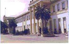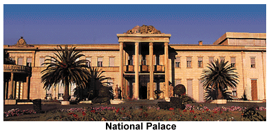 Completed in 1955, this modern Palace was built to mark Emperor Haile Selassie's Silver Jubilee. This large cream colored Palace has three grand pillared porticos on it's front that rise the height of the building. The Emperor moved into the Palace and made it his primary residence after the Massacre of the Green Salon at the Guenete Leul Palace in 1960 during a coup attempt. The palace was significantly expanded in 1966-1967. Located across Menelik II avenue from Africa Hall (site of the founding of the Organization of African Unity and Headquarters of the United Nations Economic Commission for Africa), and just accross the narrow Finfine river from Maskal Square and St. Stephen's Church, the Palace has stately grounds, impressive fountains and an interesting collection of animals in it's zoo. The gates of the Palace are topped by large carved lions. The Emperor lived here between 1961 and 1974. The Jubilee Palace was the site of the dethronement of Emperor Haile Selassie in September 1974, when 10 low ranking military officers appeared before the Emperor in the Palace library and read him the statement of the Derg officially removing him from the throne. The Derg renamed the Palace the "National Palace" and the current government of Ethiopia continues to refer to it by this name.
