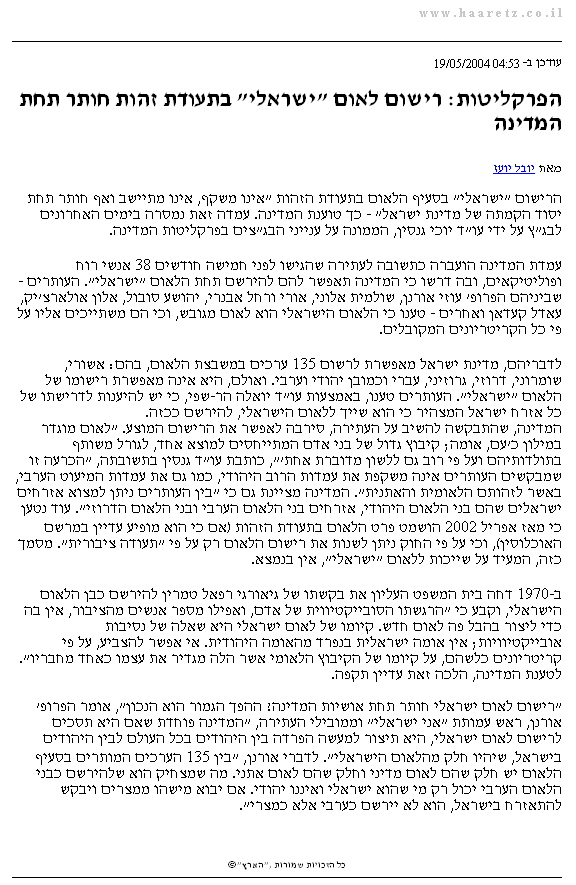 See the latest Israeli High court's decision about " Nationality" (Hebrew). By giving such answer, they (The Modern Western Non-Tranditional state) shot themselves in the head. They gradually finding out that the complicated political situation in Israel, is the direct result of not being a Jewish State.