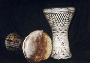 The ceramic tabla, also called a doumbek or darabukka (and a lot of other things), is a traditional instrument most commonly played in Egypt, Israel and Lebanon. The drums shown here are hand formed out of ceramic stoneware clay. The heads are made of goatskin and are glued to the body of the drum. The doumbek gets its name from the two basic sounds it produces--the deep, low-pitched "doom" and the crisp high-pitched "tek".