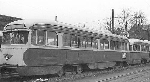 | Air PCC 1182 and an unidentified sister slumber in the yard at Keating Carhouse in 1961. Roger DuPuis Collection; photo by John Barth Jr. |