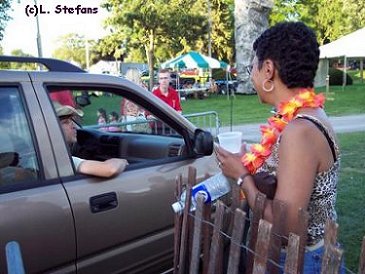 We embarked on the first leg our journey and after finding Kayla, Sam and Denise's spots up front at the stage, we went around back to find that beautiful big black HAWK bus and Dennis casting a fishing line into a box. Kirk and Mike emerged for hellos, as did Anthony, Dave and Henry. We also met Matt, Kristina and Bull (who would be our chief security officer for the dinner/auction).