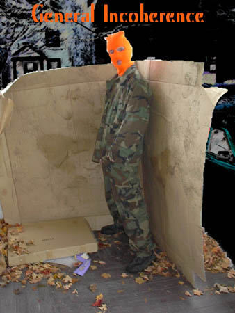 General Incoherence is a newcomer with definite potential... he wears camo and an orange ski mask, and although his white skin is obvious, he believes himself to be black apparently... if he truly were black, why would he be entering to crappy wannabe whiteboy rap like Eminem? Don't ask me... but this wigga' has got some skills, as he had beat the Disruptor in his first ever singles match with a variety of martial arts kicks and other decent maneuvers... he may not have been taken too seriously by the bigger stars at first, but time has shown that this sadly disturbed soul is actually pretty damn good! He already grabbed an IC Title reign, and has had legendary light-bulb exploding encounters with Vince Demented! And he is part of the supergroup, the DOX! As for his in between shows-time, he is said to be living in a cardboard box somewhere down in the ghetto... but we know better... he is probably sipping on some cool beverages up in the bedroom of his daddy's mansion, living off his wealthy parent's wealth as he pretends to be street smart! Yup General... we know you're type too well... put your oversized headphones on and continue living a lie! (Sorry, that was a personal staement from Psycohol)