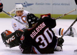 Dwayne Roloson sprawls to make a save on Brad Isbister