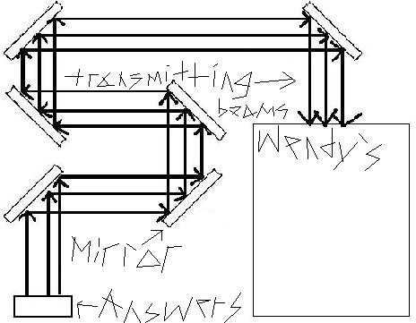 Once Secret Agent Bocian snuck in to the regents safe, he decided to transmit the answer key out of the safe using a complicated mirror system. He decided to transmit the image of the answer key onto the most important building for students in the entire world-Wendy's! |