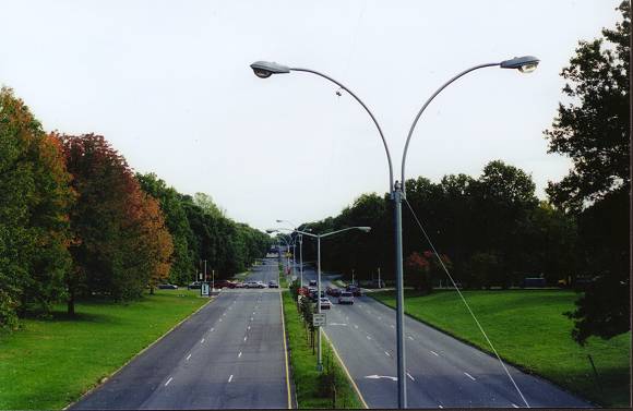 is between 73rd Avenue and Union Tpke. The bridge spanning Francis Lewis belongs to the western end of the Long Island Motor Pkwy Bikepath. The bridge is probably not much older than the Clearview Expwy, which so cruelly rendered it a bridge to nowhere in 1961, when the bikepath was cut in two, about 1 long block to the east. The entire bikepath between here and the Clearview was nearly completely overgrown with Cunningham forest. Except for scattered remains of the bikepath's cement railposts, or splotches of the Vanderbilt's old roadbed, you'd have never know it was there. The last, crumbling spur of the bikepath ran unseen to the right, parallel with Francis Lewis, alongside 199th Street, up to the Long Island Expwy, where it finally gave up the ghost before a public school playground, although bikers could still continue over grass and a walkbridge, across the expressway, into Kissena Corridor Park. |
