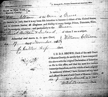The exact date of William and Anna's immigration to the United States has yet to be determined. Estimates would be 1850-1853. A partition of Intent was filed in Monroe Co., NY in 1853 for a William Ellison and the final Naturalization papers were dated 1860.