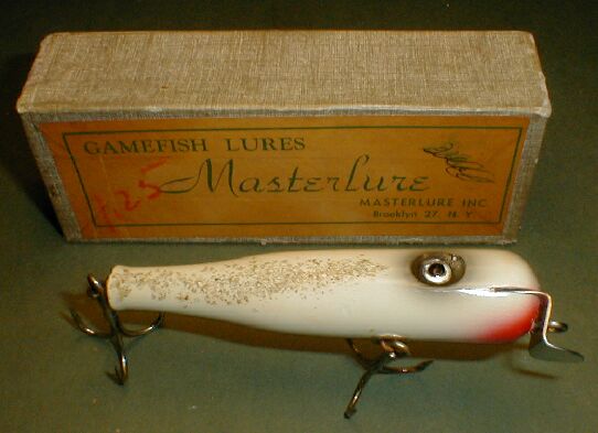 This page is being set aside for the results of recent saltwater lure auctions on some of the popular internet auction sites. A few nice lures came up last month with two selling and the other not meeting reserve. First up was a beautiful Masterlure from Brooklyn, NY painted in white ghost and selling for $316.99. Nice price for both buyer and seller. A tough baby swimmer in one of the earliest boxes.