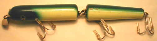 Second up is a nice baby jointed Masterlure Eel in River-Green color. It was excellent in the original box and sold for $123.45. Nice lure with some minor problems, paper was stuck to it but that should come off with a little careful cleaning.