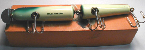 Lots of auctions of saltwater stuff last month but no real high dollar baits. People still are purchasing lures but it seems the buying frenzy that drove prices so high on some of the saltwater pieces has died down since the end of last year. Great for us collectors trying to buy a nice lure! First up was a Floyd Roman Nike made by Real Lures of Three Rivers, MA. This looks like the medium sized swimmer or Little Nike. Selling for a mere $66.67 this was a steal. It came in it's original box and was in almost excellent condition.