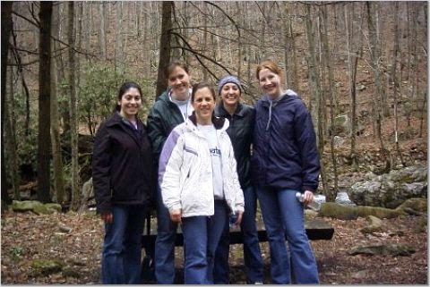 Marie, Michelle, Me, Kirsten and Jen hiking at the Cascades in Blacksburg, VA during a girl's weekend in April 2004