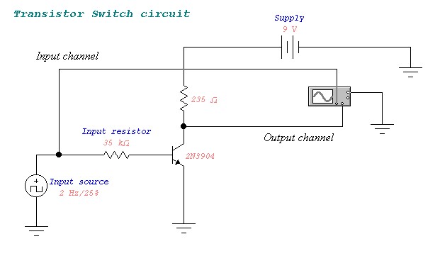 This is a page that displays the schematic of the transistor switch and its waveform. This is the circuit that was used for analysis of the switch behavior. Note the oscilloscope connected in the circuit with both channels and its ground.