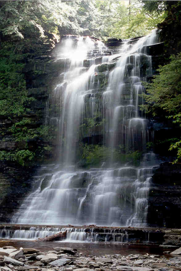 The lower waterfall on the Plotter Kill is maybe slightly less high than the upper, perhaps 50 feet. It has a very similar appearence, with the addition of a little shelf cascade at the bottom of the falls. The picture on this page is of this falls.