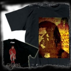 WWF shirt designed with 2 Raven close up face silhouettes on front. One close up of Raven's face and the other Raven's grunge look. With various words in a celtic font face to describe his tortured soul.